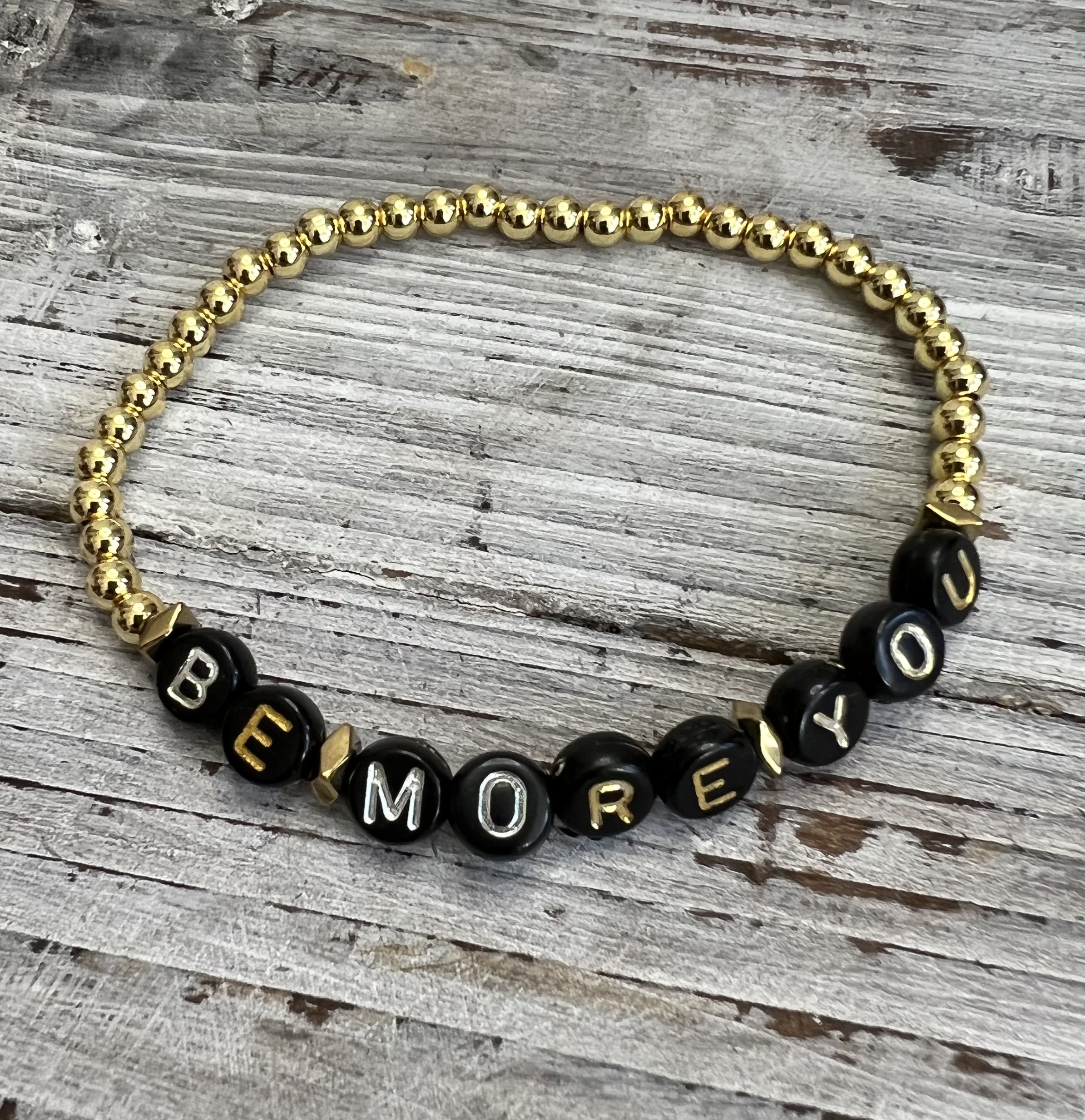 Handgjort elastiskt dressy armband i fin kvalitet & tyngd med allergivänliga koppar pärlor & vackra texten i guld ”BE MORE YOU”. Kommer i en fin smyckespåse!